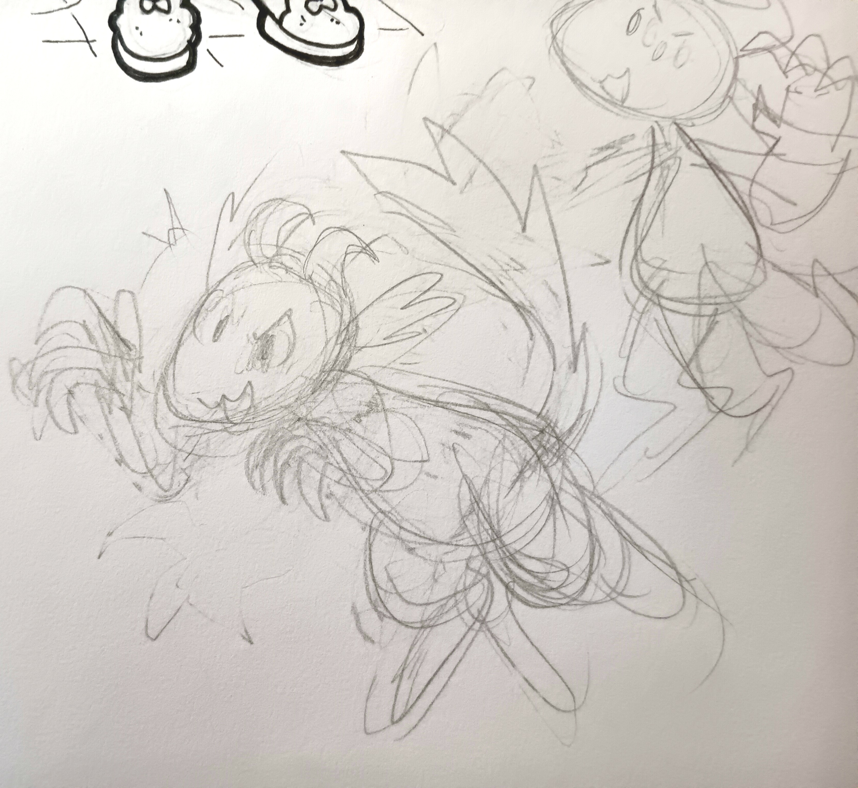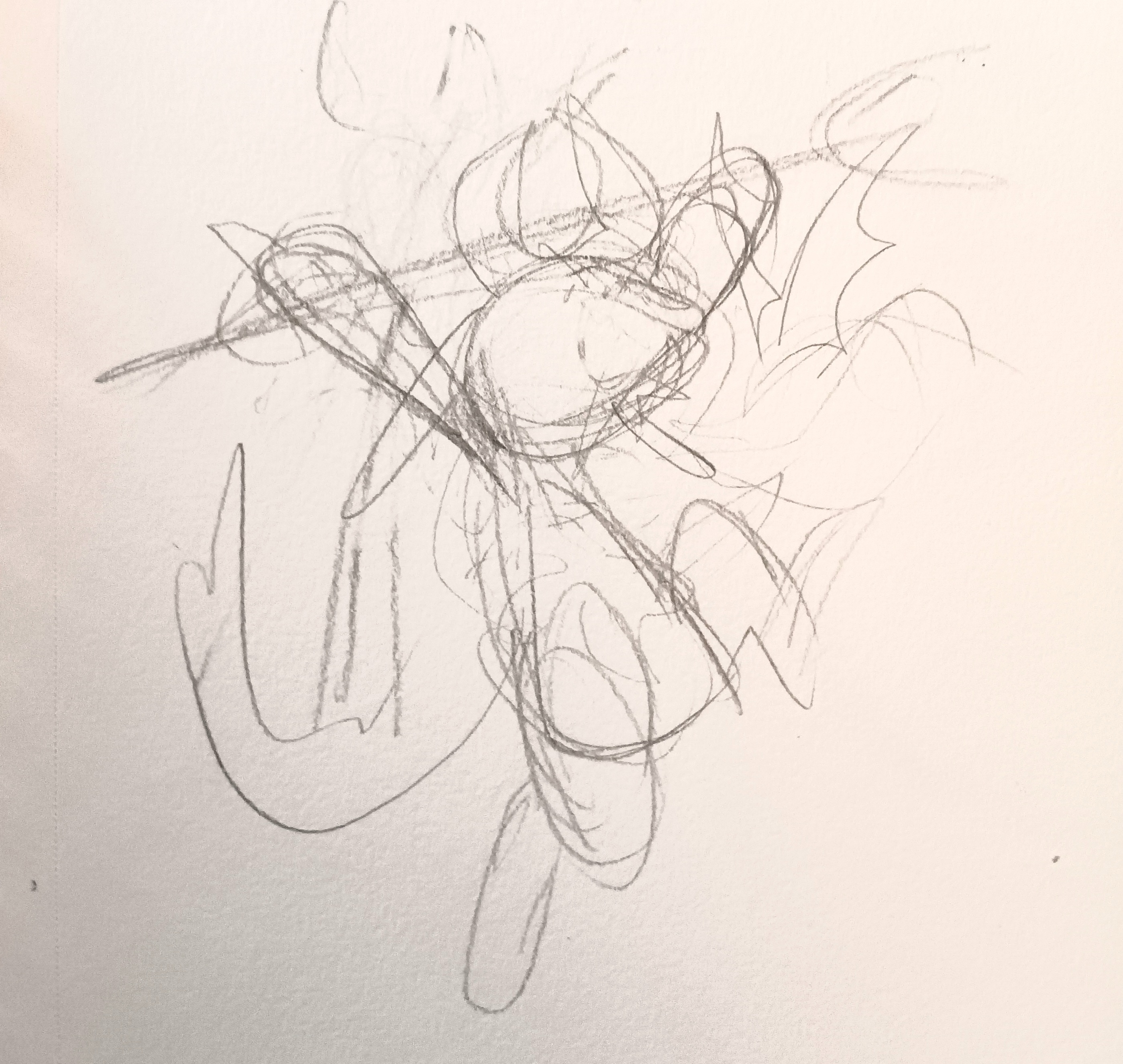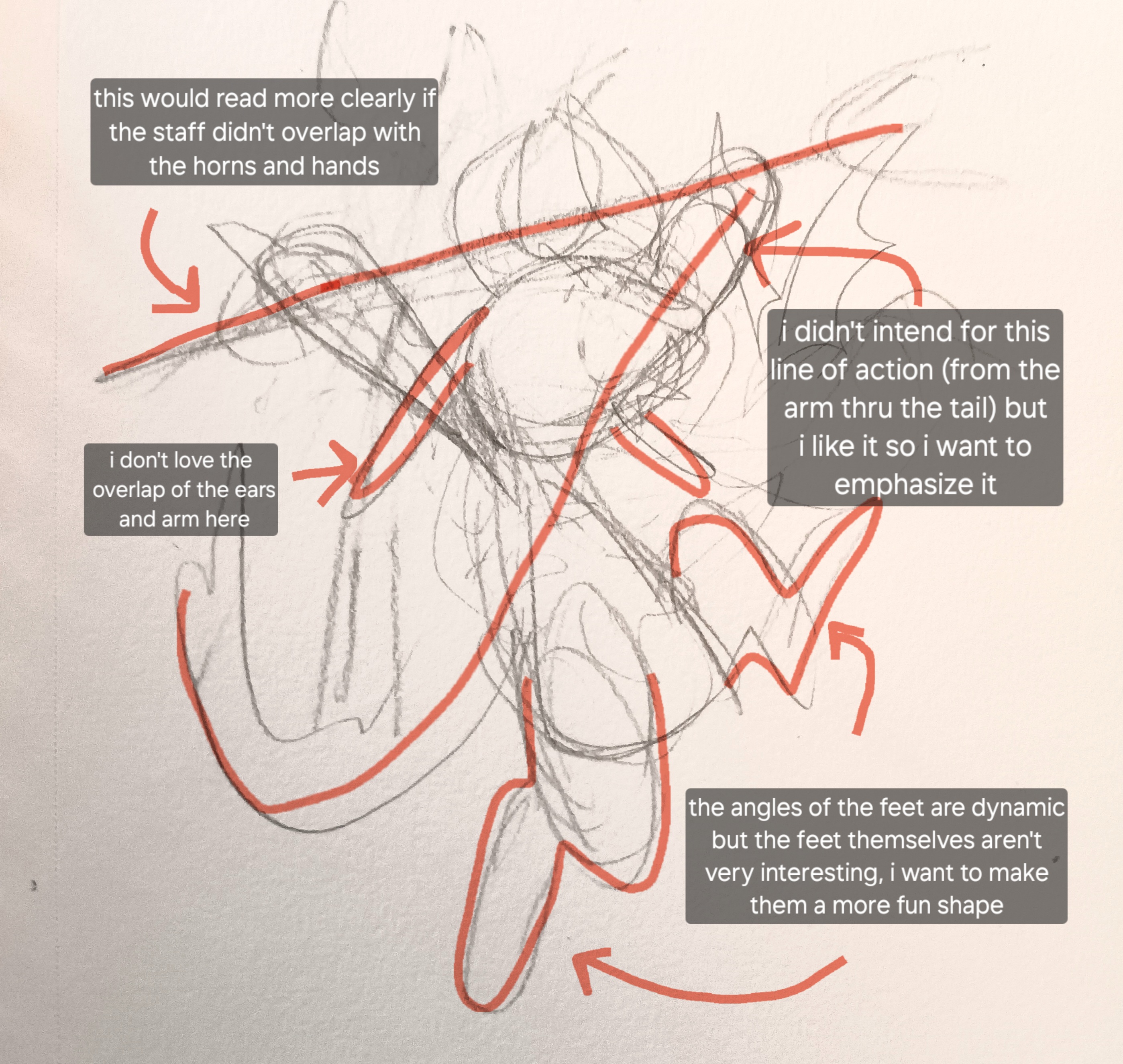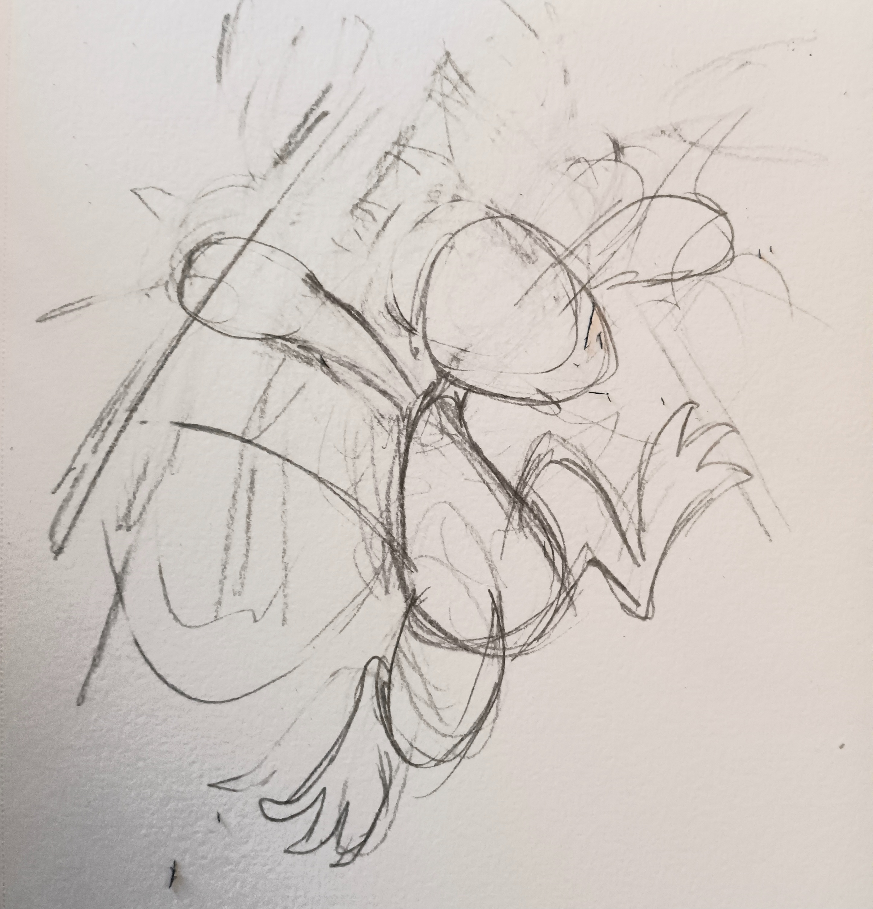 at this stage, i don't erase much. you can see multiple ideas for limb placement and shapes laid on top of each other. any one of those lines could end up being interesting, so i keep them all.